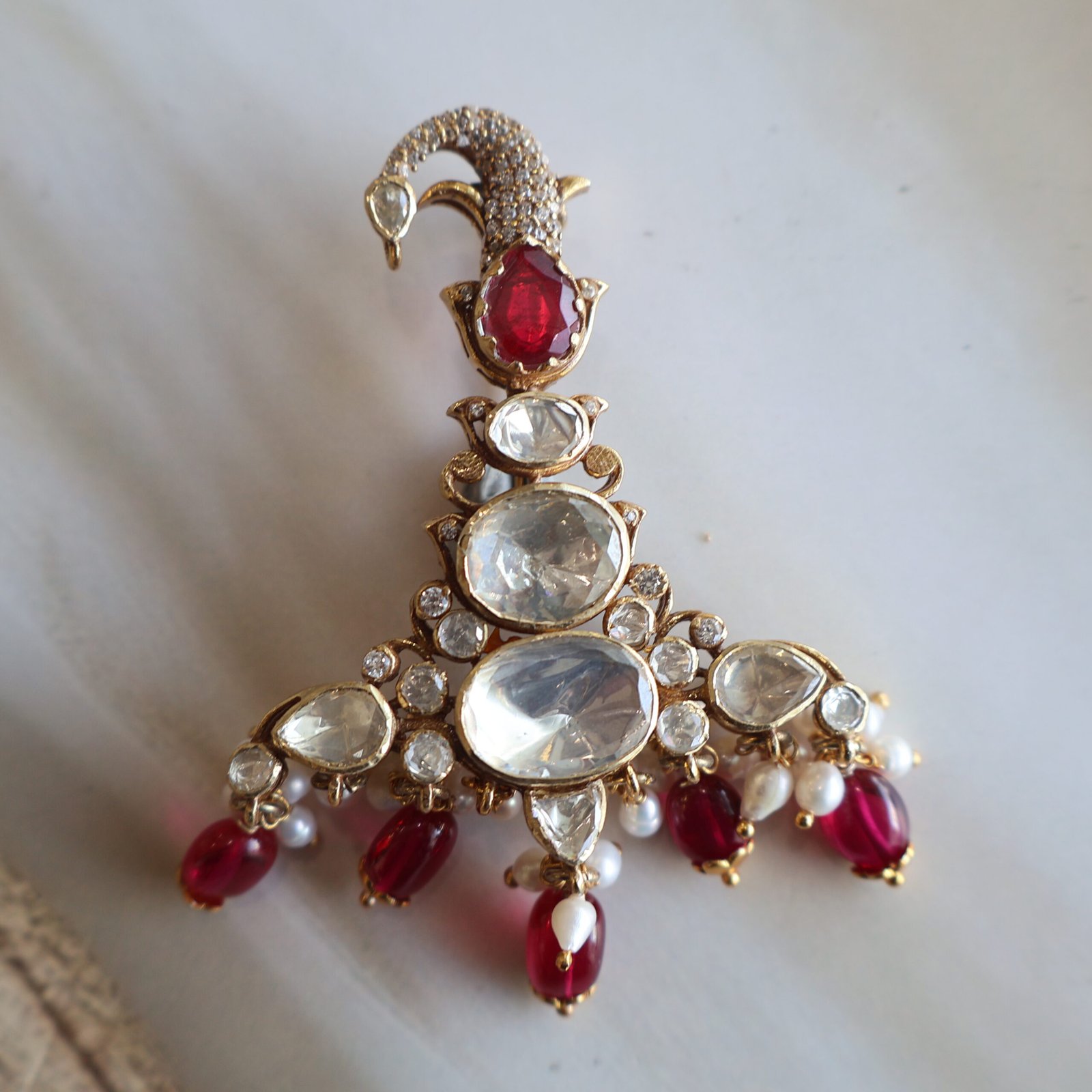 An exquisite 92.5 sterling silver sarpech embellished with shimmering moissanite polkies, vibrant colour stones, and delicate freshwater pearls, finished with a rich gold polish.