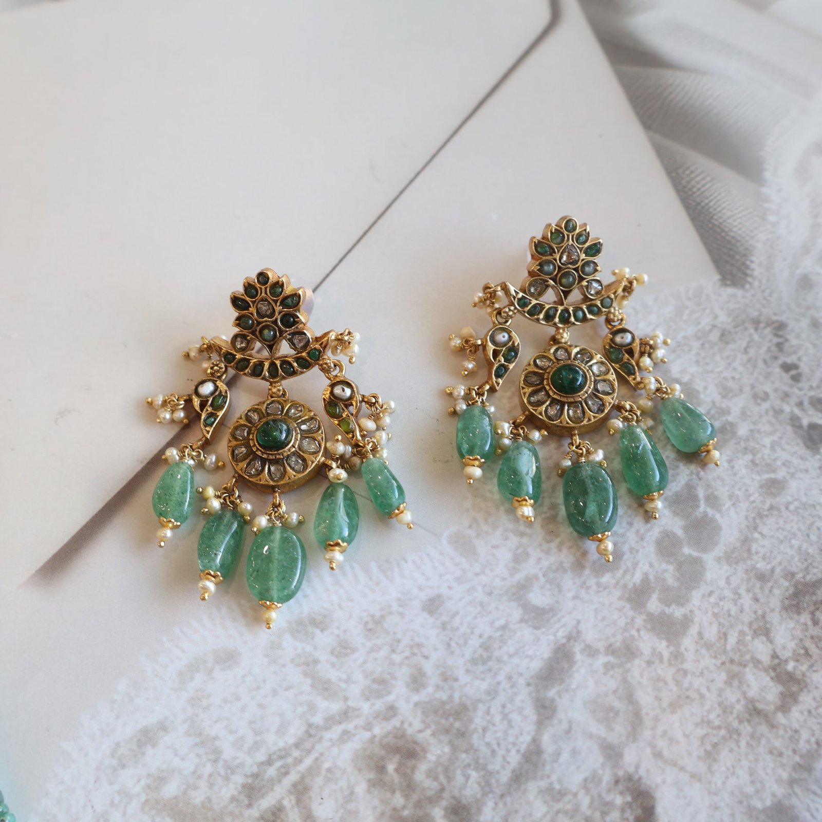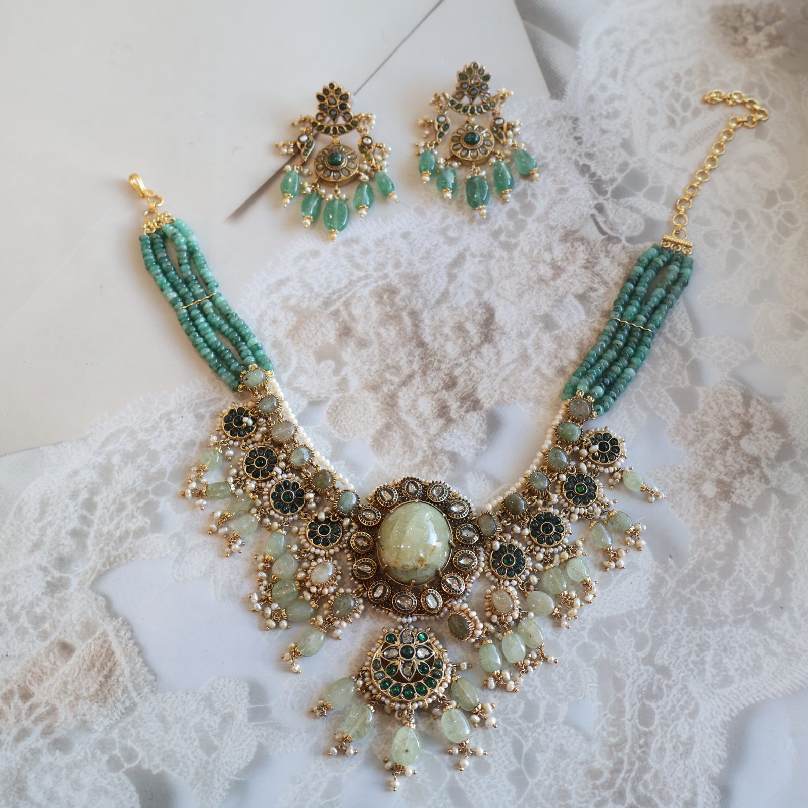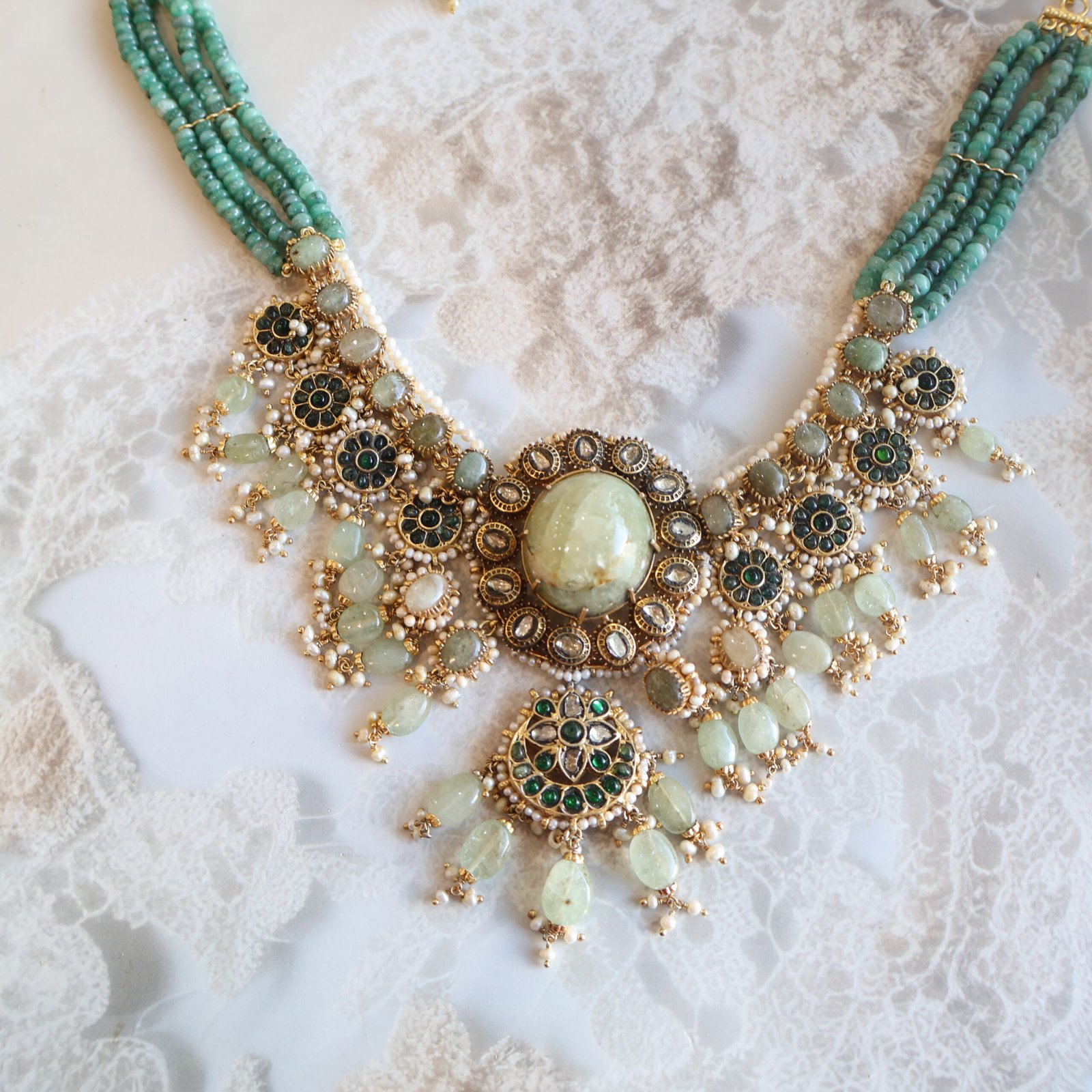92.5 silver jewellery set with diamond polkies, natural gemstones, emeralds, and freshwater pearls for a rich and elegant look.