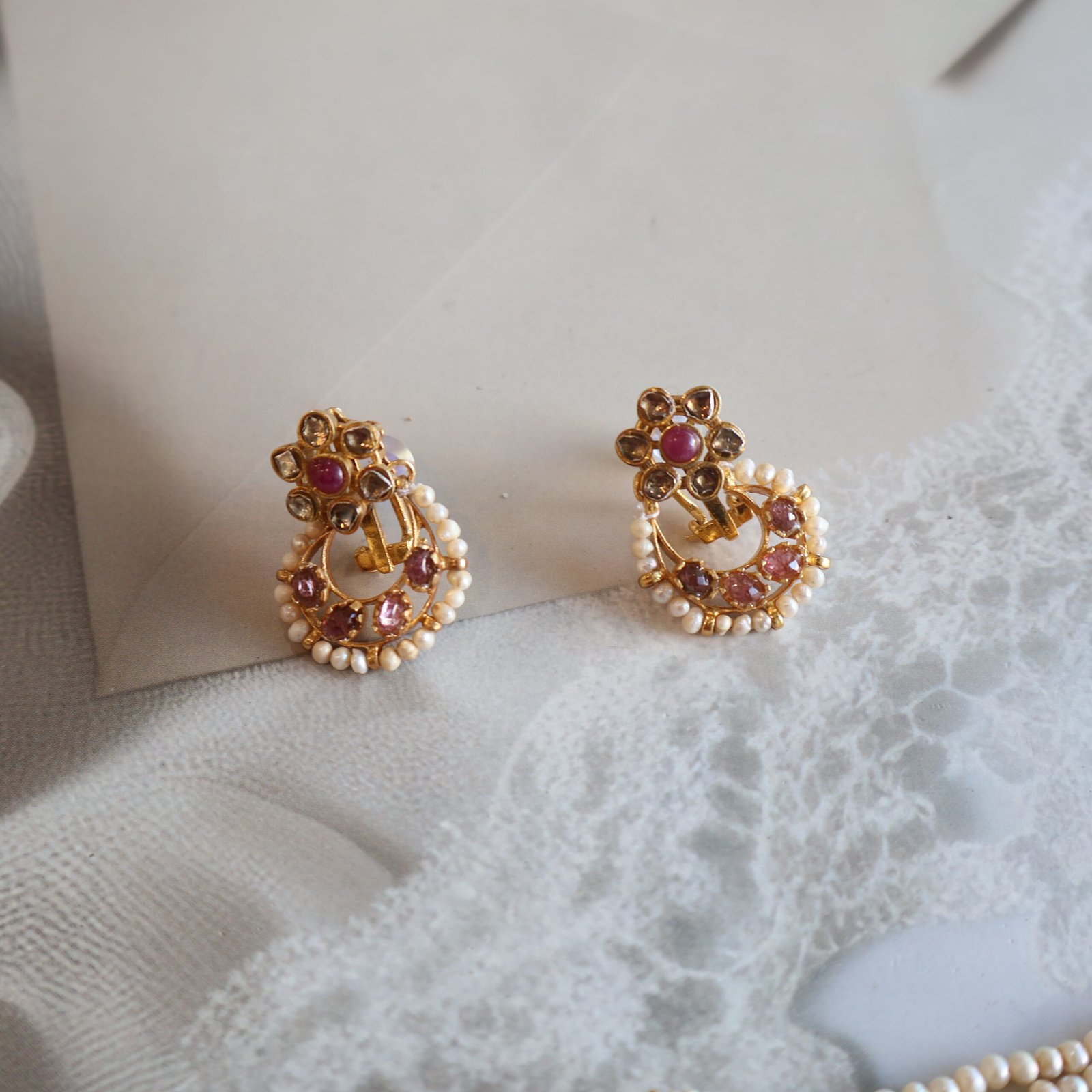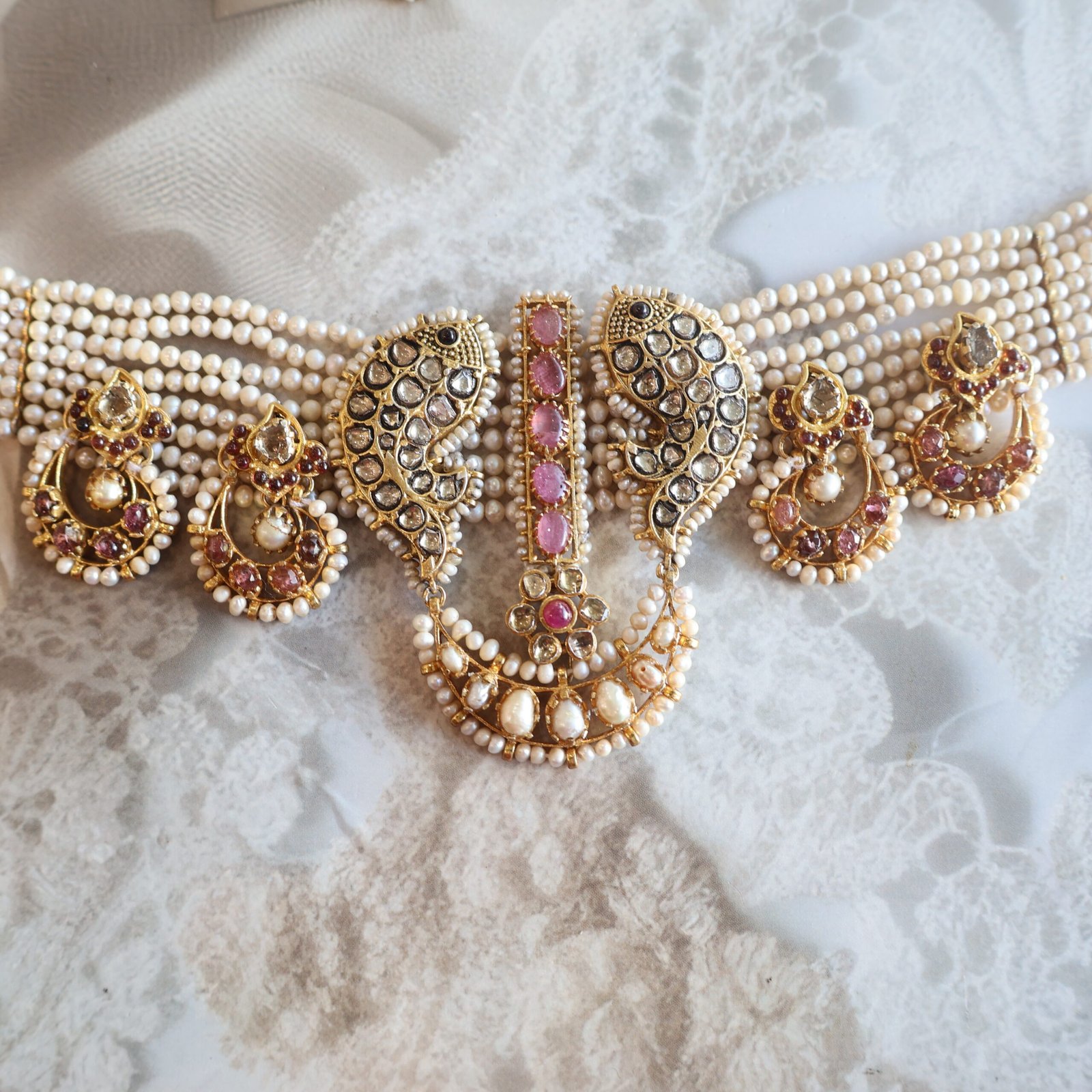 92.5 silver jewellery set with diamond polkies, natural gemstones, and freshwater pearls for a timeless and elegant look.