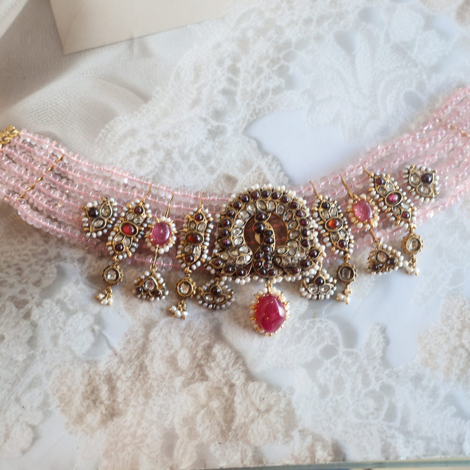 92.5 silver jewellery set with diamond polkies, rubies, natural gemstones, and freshwater pearls for a rich and elegant look.