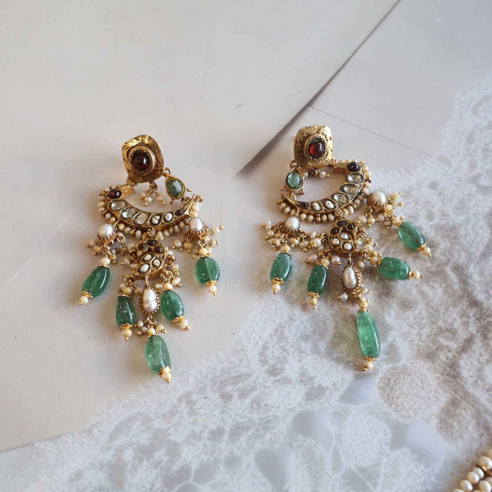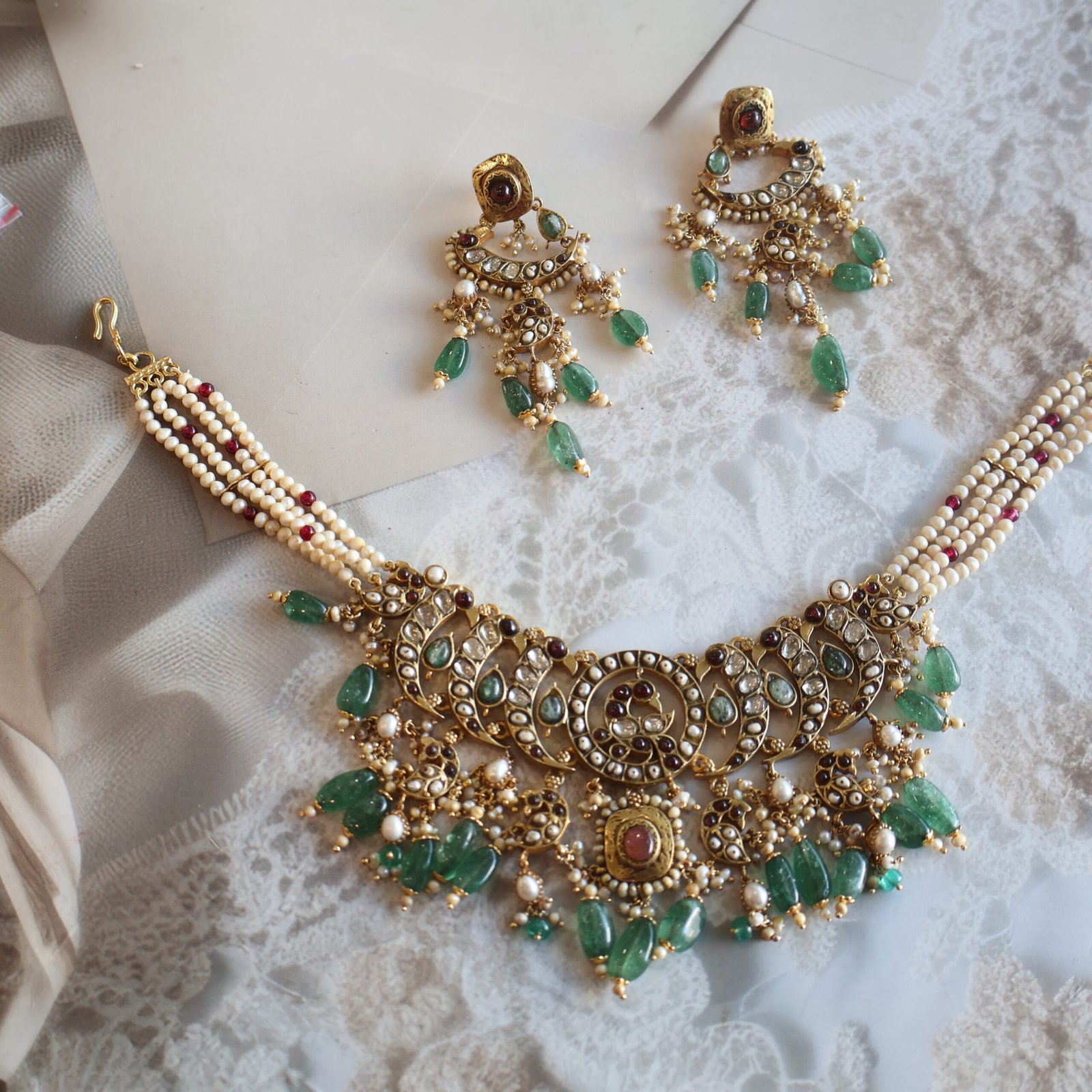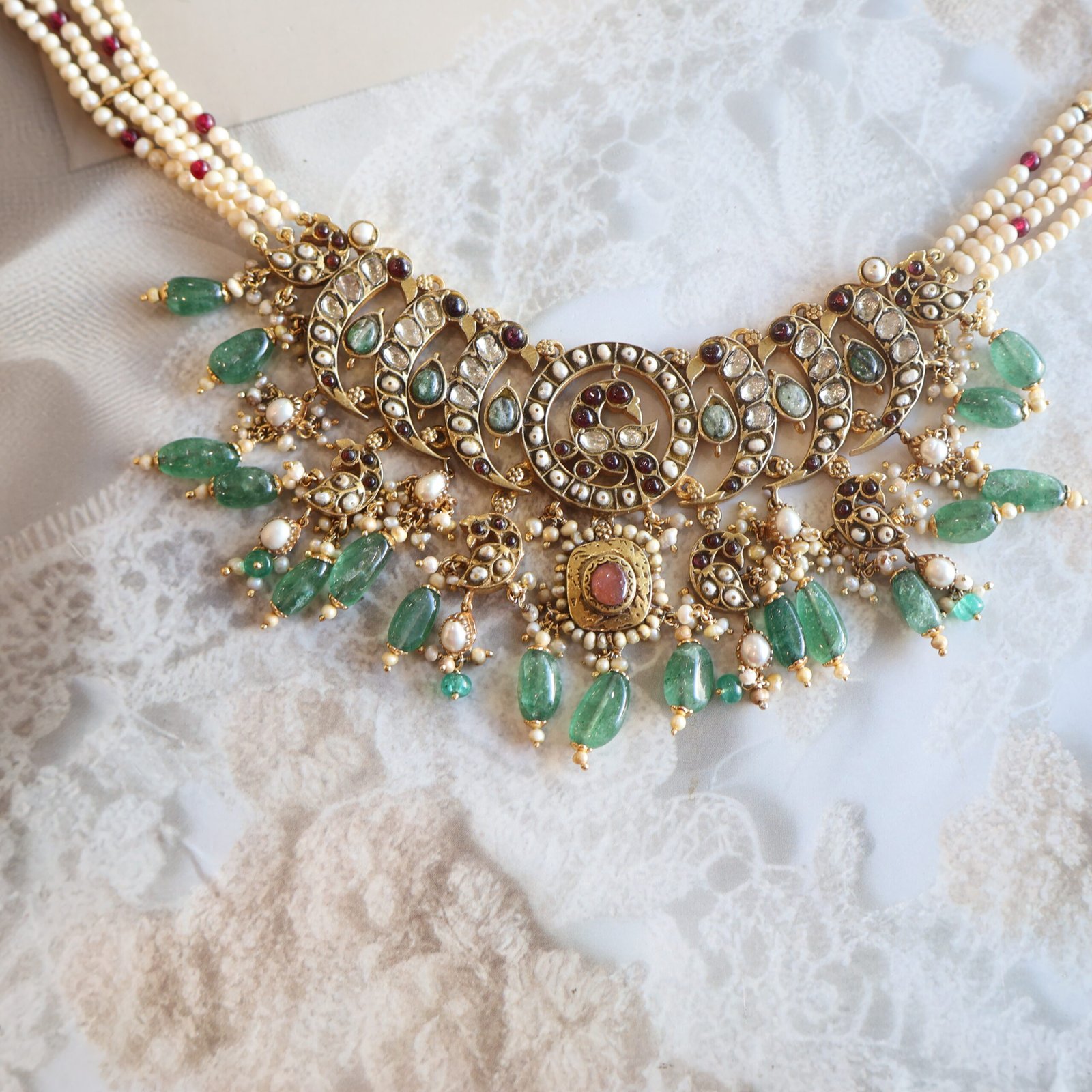 92.5 silver jewellery piece with diamond polkies, natural gemstones, and freshwater pearls for a timeless and elegant look.