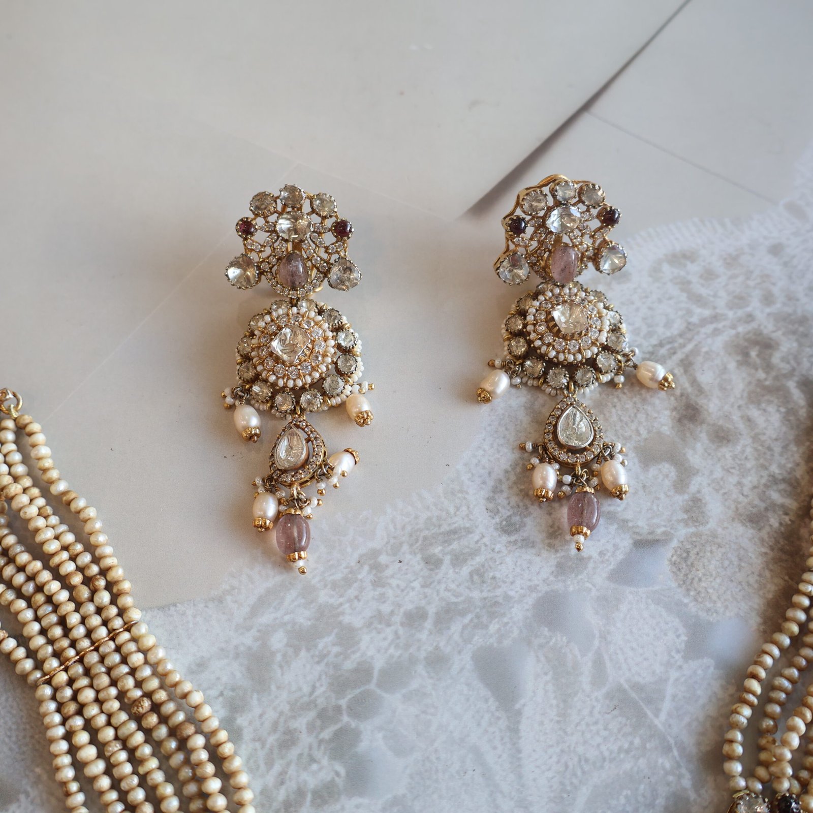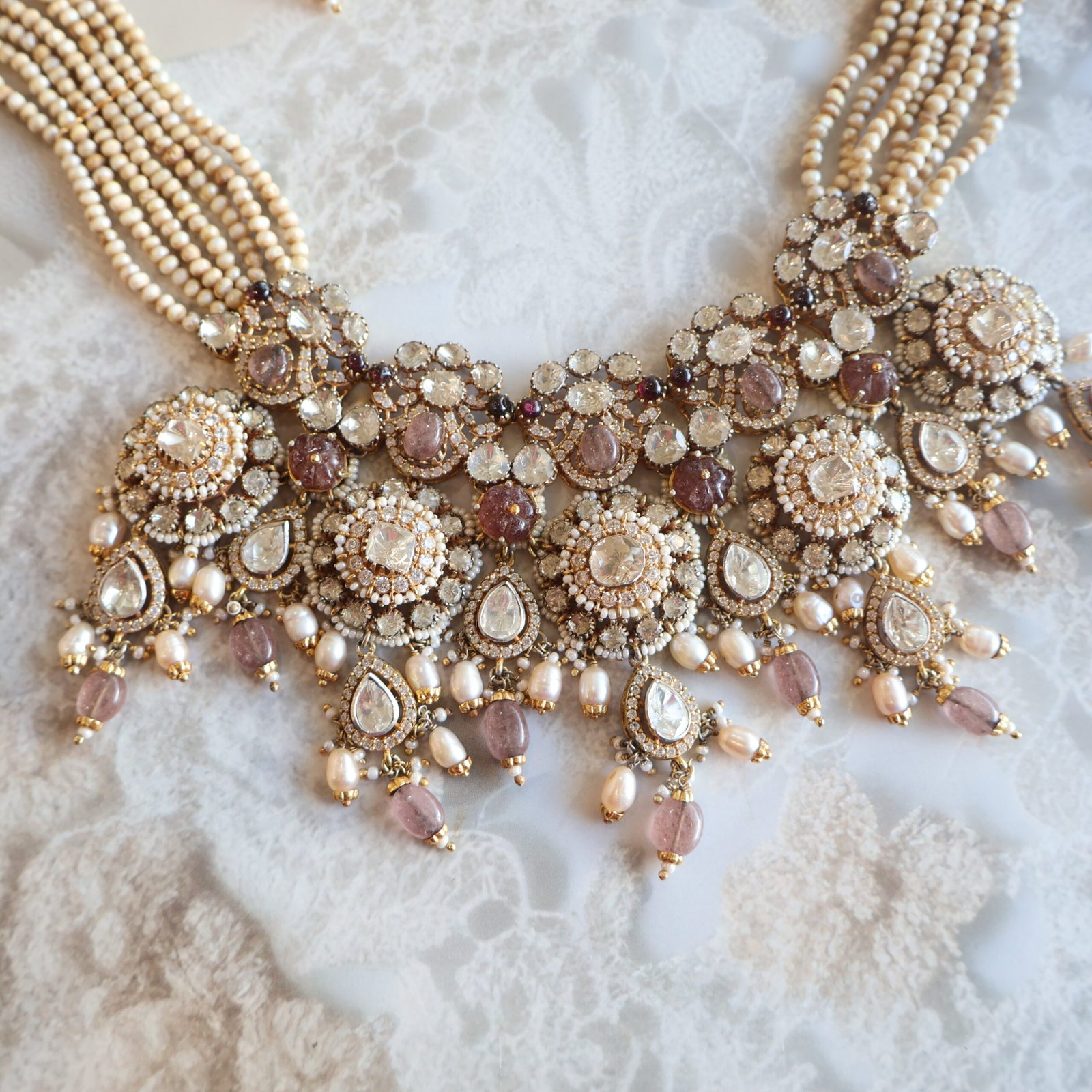 92.5 silver jewellery set adorned with moissanite polkies, semi-precious stones, and freshwater pearls for a graceful and elegant look.