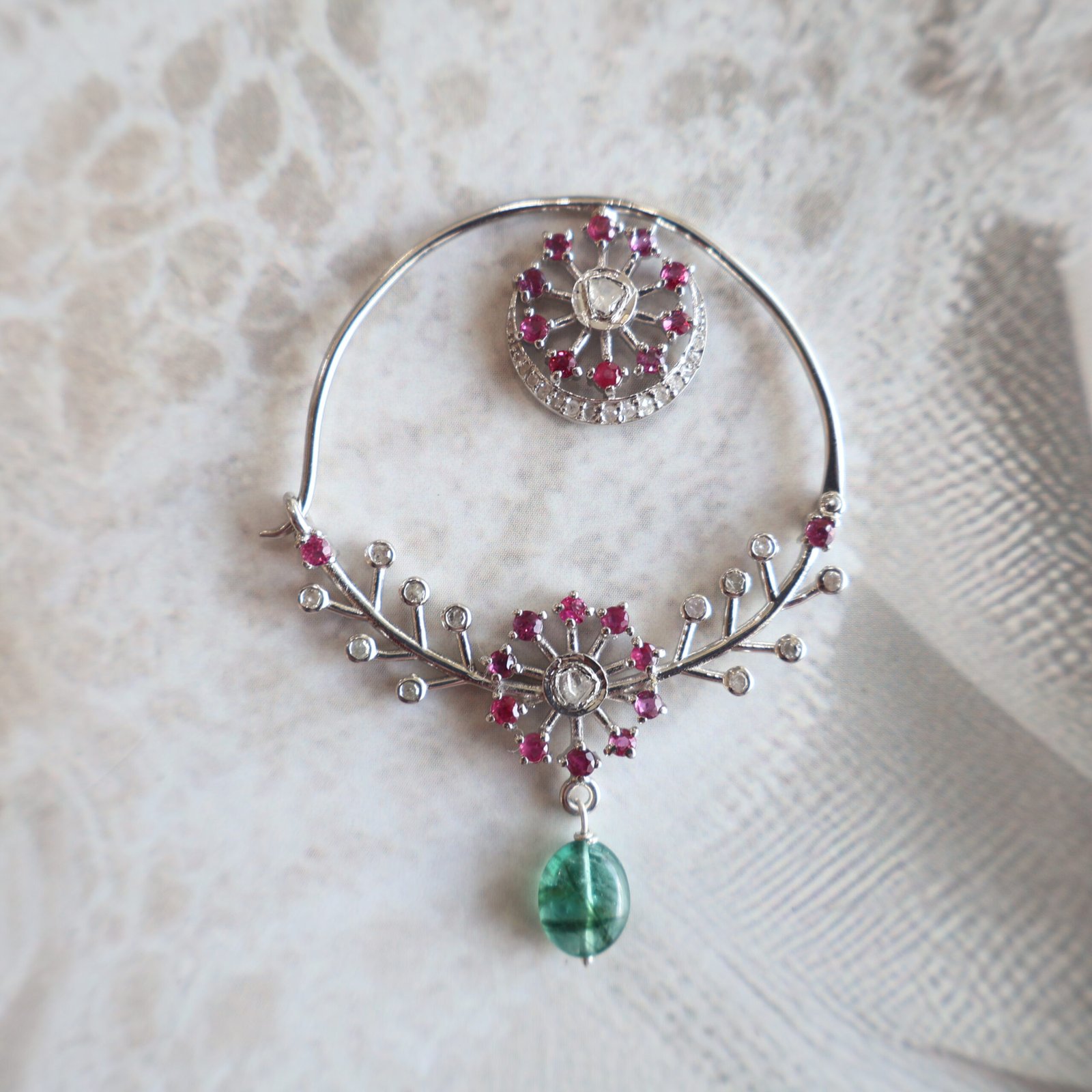 An exquisite 92.5 sterling silver nath, delicately studded with natural diamonds, Burma rubies, and natural diamond polkies, crafted for timeless bridal elegance.