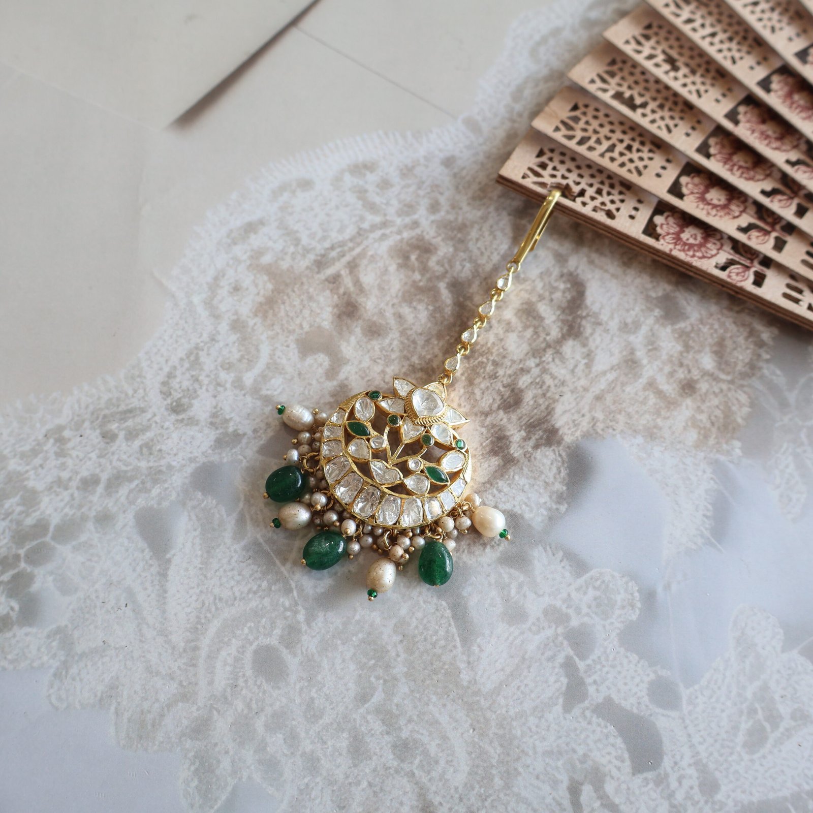 This vintage-inspired Maang Tikka draws from classic Indian jewellery traditions. The intricate setting of monzonite stones, complemented by the timeless beauty of freshwater pearls, creates an heirloom-style aesthetic.