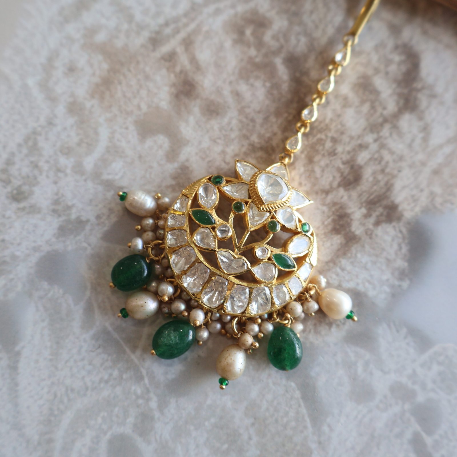 Vintage-style Maang Tikka adorned with monzonite stones and freshwater pearls.