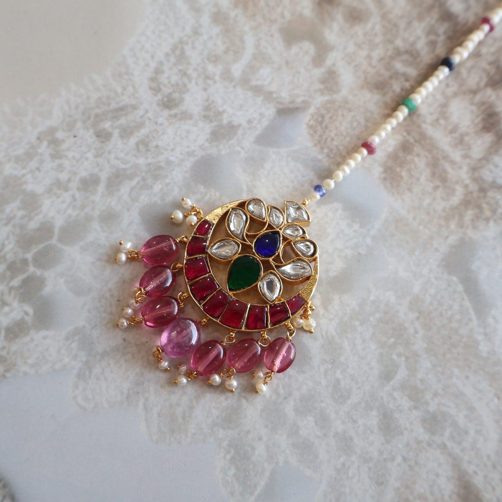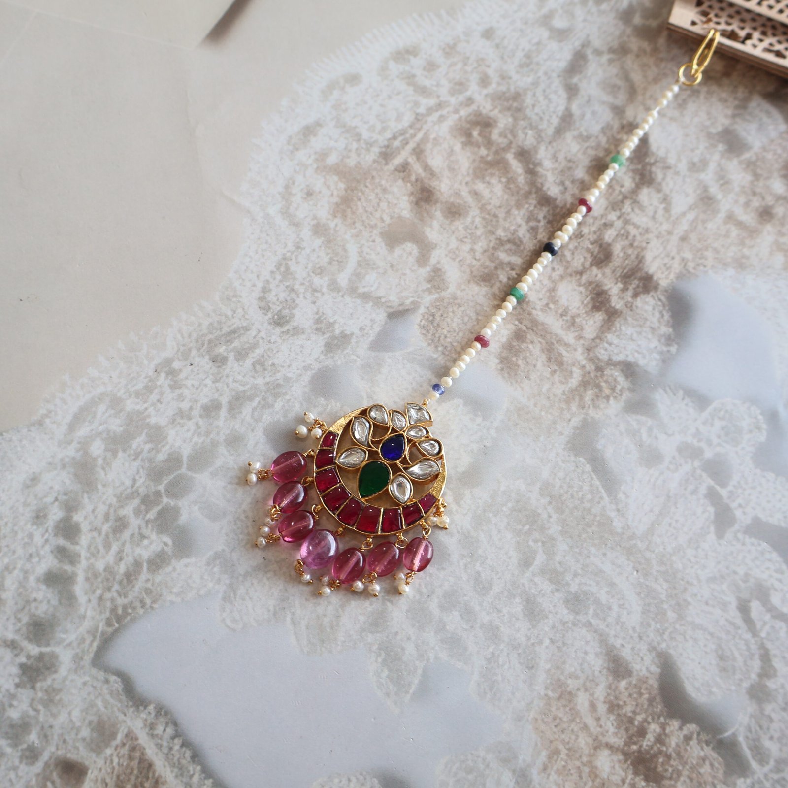 Perfect for bridal ensembles and cultural celebrations, this Maang Tikka blends old-world charm with modern comfort. Its refined craftsmanship and graceful design make it a versatile and cherished addition to any traditional jewellery collection.