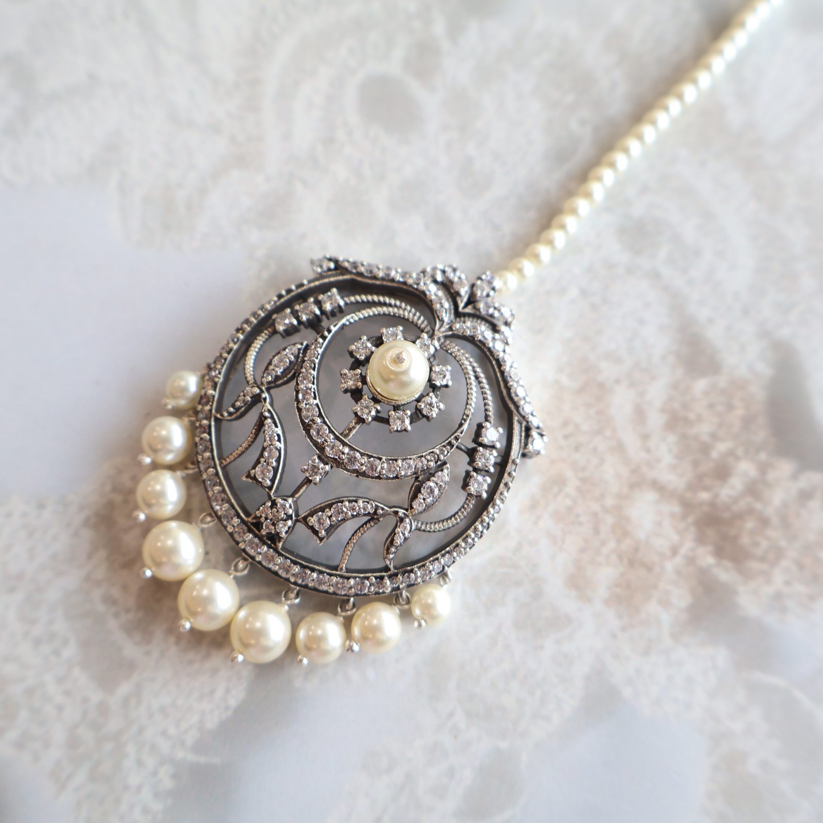 Elegant 92.5 silver Mang Tikka with zircon stones and colour tones for a refined traditional look.